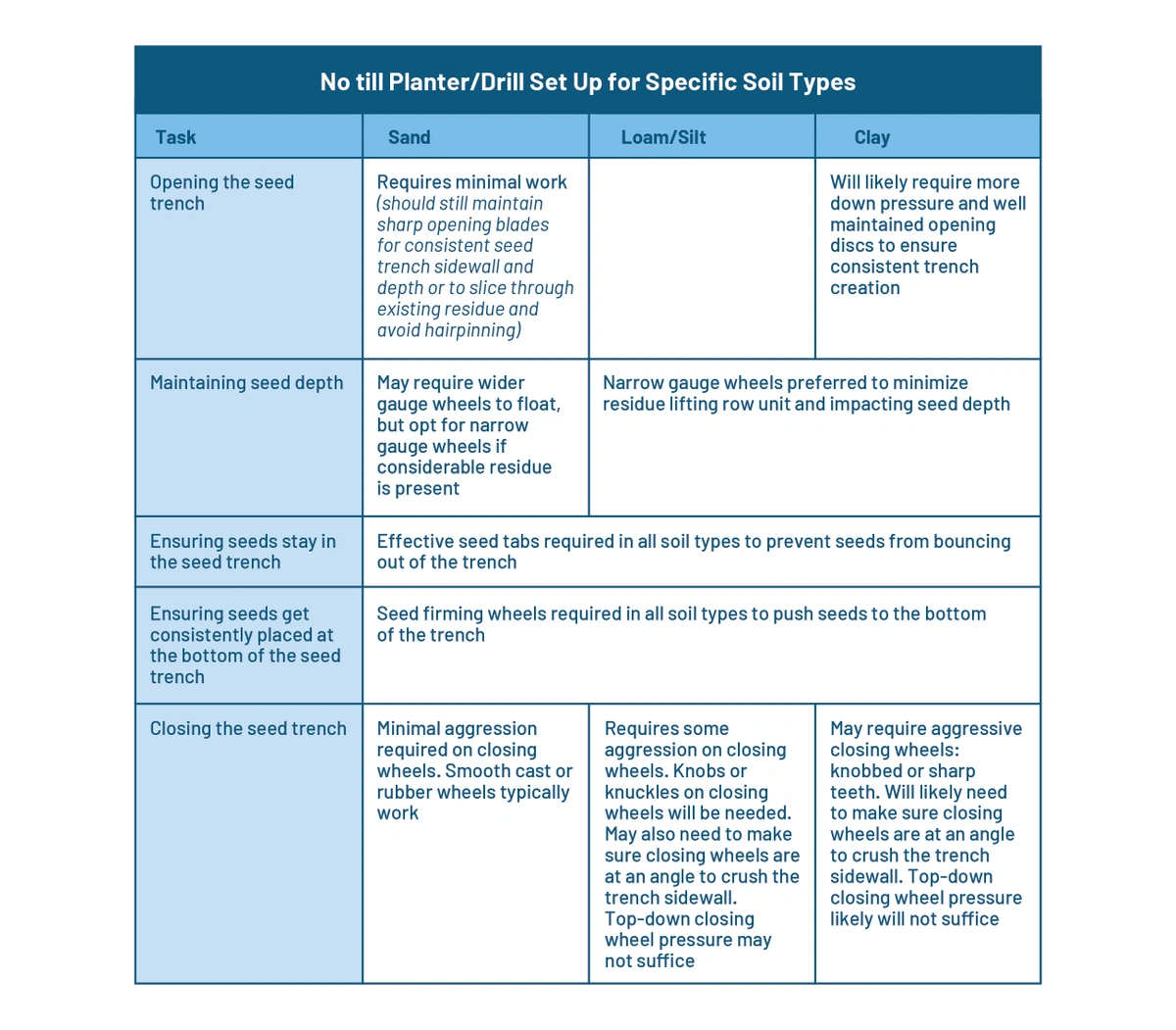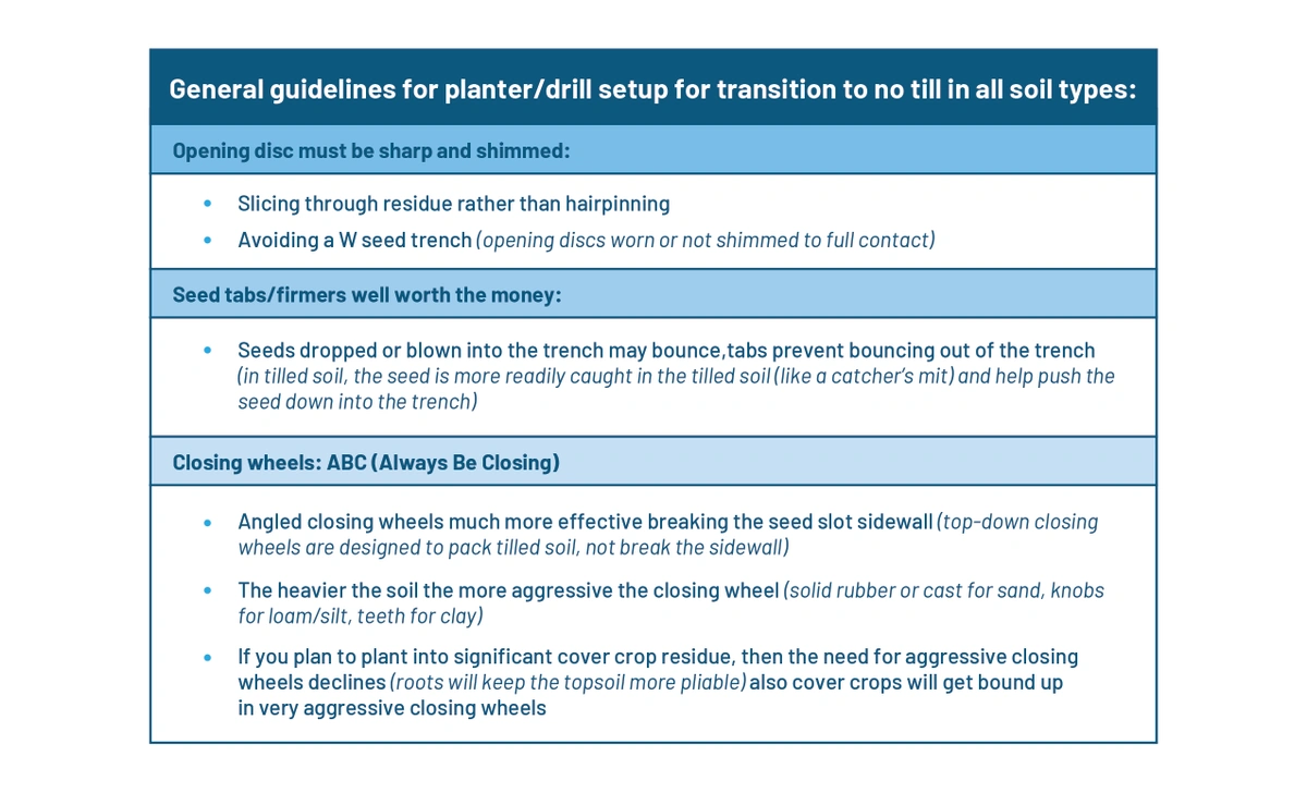 No-till fundamentally demands a change in how we think about planting and how drills and planters meet the three goals of a planting pass: 1) opening the seed furrow, 2) placing the seed consistently at the bottom of the furrow at a consistent depth, and 3) closing the furrow over the seed. When broken down into these tasks, it becomes apparent how planting equipment must change to meet each need.