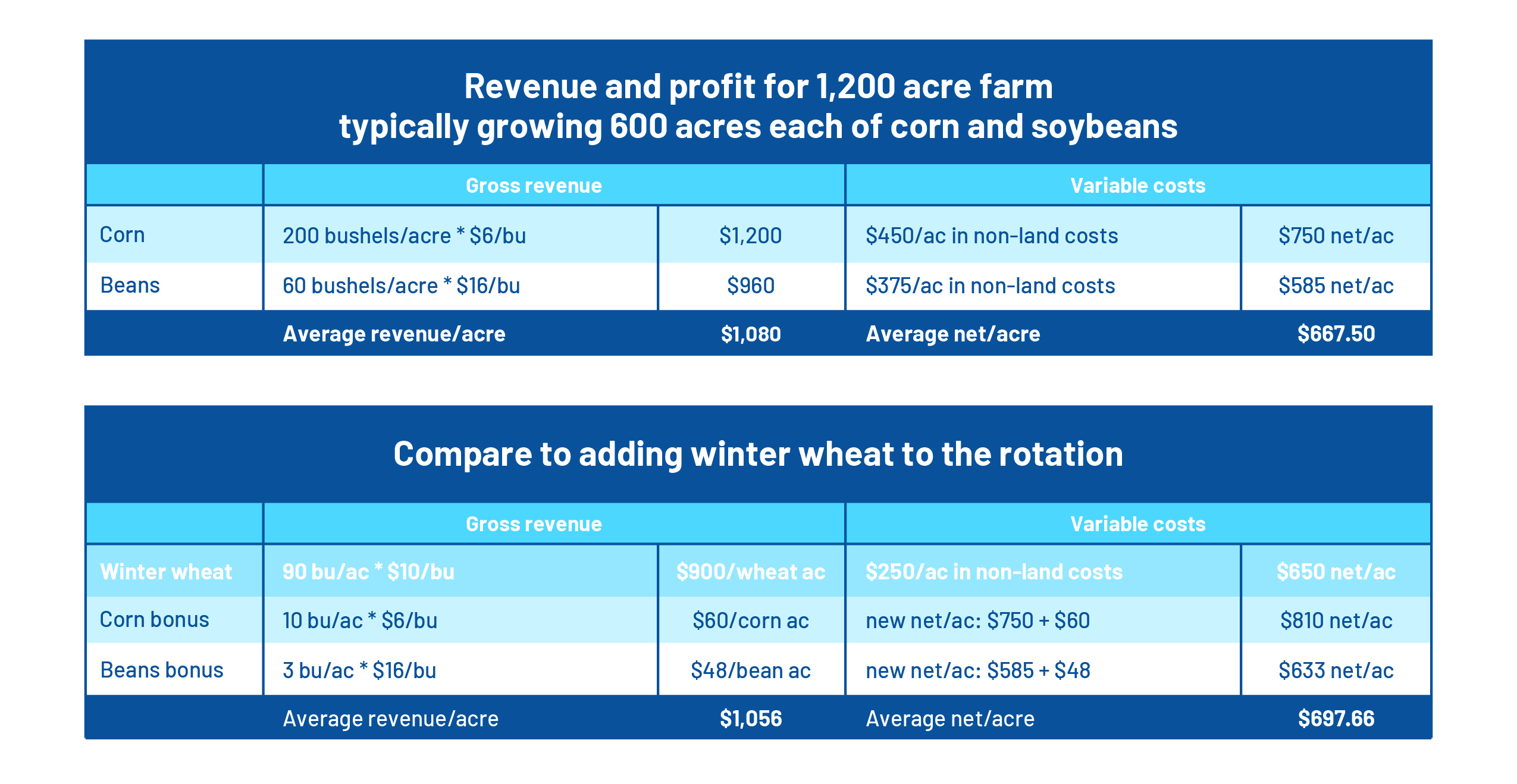 Five percent. That’s the typical corn and soy yield boost that most studies on the topic show can result by adding a small grain to a corn-soybeans rotation. So on average, that means three more bushels of soybeans and around ten more bushels of corn per acre. When we calculate that value and attribute it to the small grains we see an even better return, especially when we consider costs per acre.